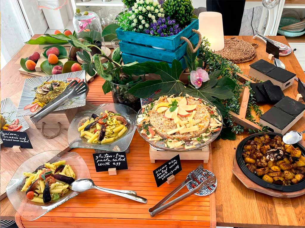 Vores 3 daglige måltider er primært vegetariske. Dog er der en aften med fisk, og om torsdagen kan vi glæde os til en original spansk paella med skaldyr.